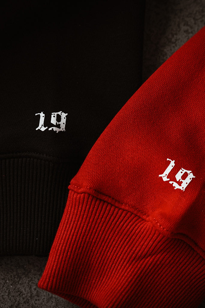 Featuring the "XIX Signature Jumper " available in Black & Red. The signature Jumper is well worth having, featuring the "ONE NINE" detail logo, regular fit, ribbed hemline, exposed zipper.