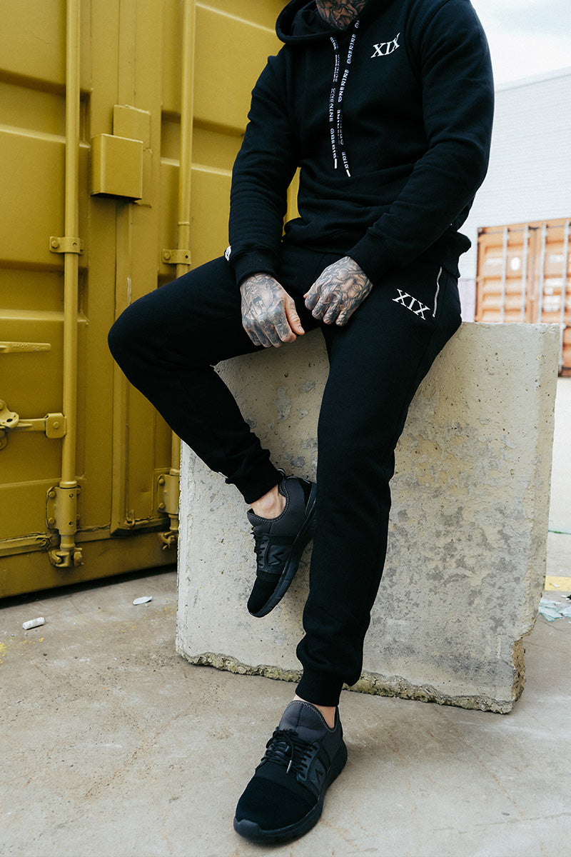 Featuring the "XIX Track Pant " available in Black, Beige & Grey. The signature track pant is well worth having, featuring  "ONE NINE" detail, tapered leg, with side pockets and waist drawstring.